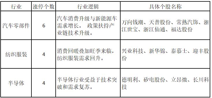 从行业特征来看,今日涨停板个股中,汽车零部件、纺织服装、半导体行业的个股最多。