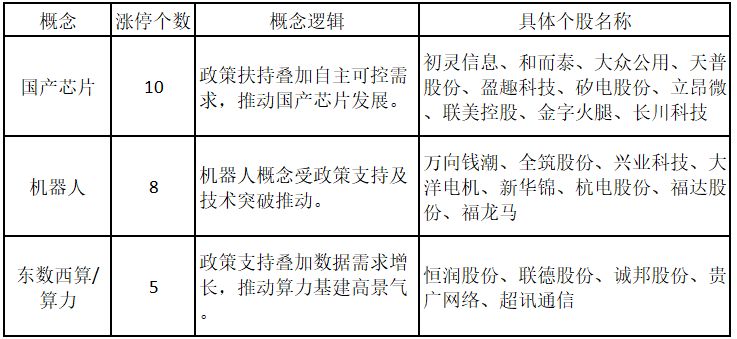从概念特征来看,今日涨停板个股中,国产芯片、机器人、东数西算/算力概念的个股最多。欢迎大家关注微信公众号“道达号”,“道达涨停复盘”栏目为大家复盘市场涨停数据。
