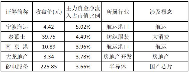 主力资金净流入金额占市值比例排名前5的个股分别为宁波海运、泰慕士、南京港、大龙地产、矽电股份。