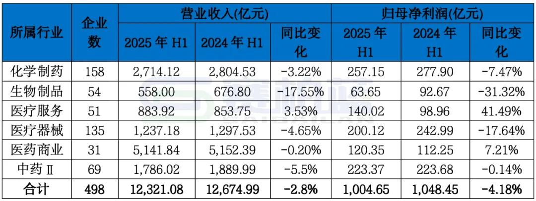 2025年上半年,A股医药行业498家上市公司合计实现营收12,321亿元,同比下降2.79%;实现归母净利润1074亿元,同比下降4.18%,与2024年全年的业绩变化趋势类似。