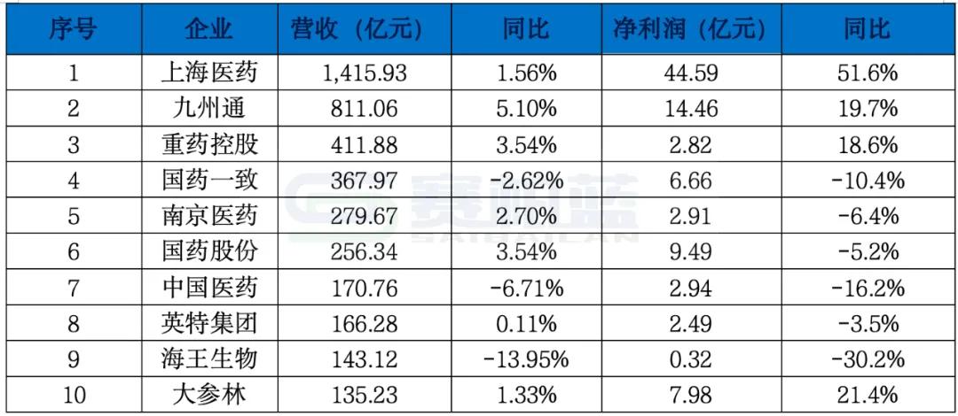 医药商业行业头部企业营收规模显著,市场集中度较高,但企业间成长性分化明显。上海医药以超1400亿元的营收居于首位,同比增长1.56%,归母净利润大幅增长50%,盈利能力突出。九州通和重药控股分别位列第二、三位,营收均实现个位数增长,净利润增速接近20%,显著高于行业其他企业。另一方面,部分企业如国药一致、中国医药和海王生物等,出现营收与净利润双双下滑的局面。