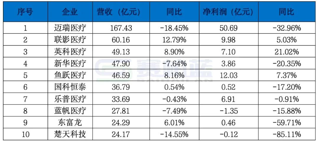 迈瑞医疗仍处于行业领先地位,营收规模超过167亿元,尽管同比下滑18.45%,仍远高于其他企业。联影医疗位列第二,营收突破60亿元,同比增长约2%;英科医疗排名第三,营收接近50亿元,同比增长近9%。