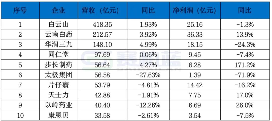 2025年上半年,中药行业与医疗器械领域类似,整体表现呈现分化态势。营收规模超过百亿元的企业有三家:白云山、云南白药和华润三九。白云山营收规模最大,同比增长2%,其中医药商业占比较高;云南白药营收超过210亿元,同比增长近4%;华润三九营收接近150亿元,同比增长5%。