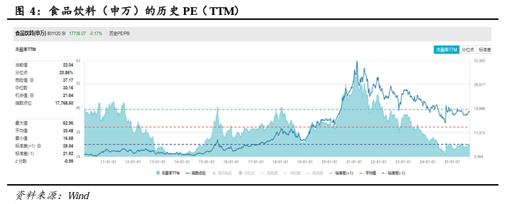 截至2025年9月15日,食品饮料(申万)的PE(TTM)为22.04,在-1X标准差附近,位于2010年以来的20.86%分位。