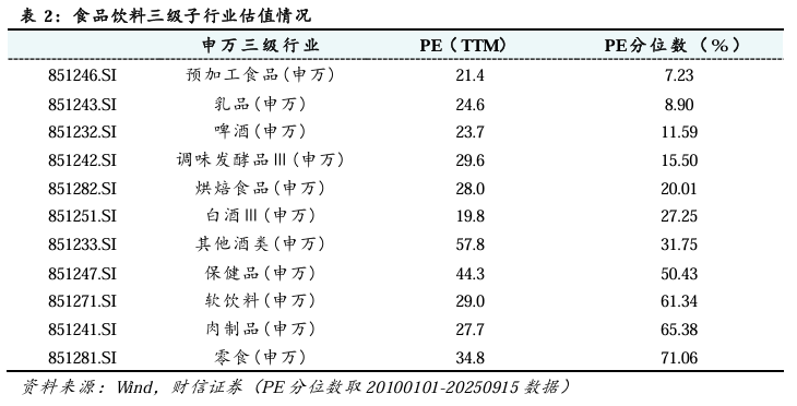 看申万三级子行业,部分细分行业估值有所修复,预加工食品、乳品和啤酒的估值仍处于2010年以来相对低位,零食、肉制品、软饮料和保健品处于较高的估值分位水平。