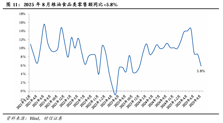2025年8月,限额以上粮油食品类零售额同比增长5.8%至1848亿元,连续三个月增速低于双位数,有一定的基数原因。1-8月,限额以上粮油食品类零售额累计同比增长11.0%。
