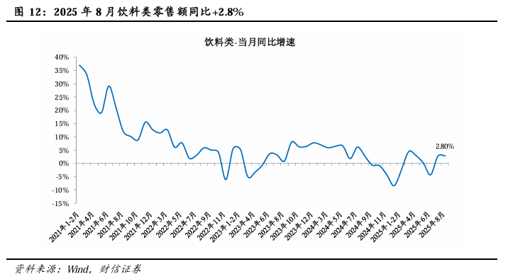 2025年8月,限额以上饮料类零售额同比上升2.8%至285亿元,旺季销售预计有所回暖。1-8月,限额以上饮料类零售额累计同比由负转正,同比增长0.2%。