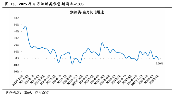 2025年8月,限额以上烟酒类零售额同比下滑2.3%至450亿元,增速转负,预计主要因基数和“禁酒令”影响,从绝对值看,6月/7月/8月烟酒类商品零售额分别为516/433/450亿元。1-8月,限额以上烟酒类零售额累计同比增长4.3%。