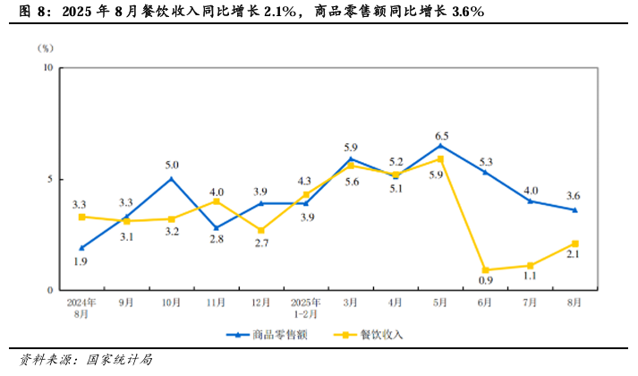 8月份,商品零售额35172亿元,同比增长3.6%,增速较上月放缓0.4个百分点,为连续3个月增速放缓;餐饮收入4496亿元,增长2.1%,增速较上月提高1.0个百分点。
