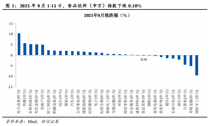 2025年9月以来(9月1-15日),A股市场波动变大,分化加剧。其中,食品饮料(申万)指数下跌0.10%,跑输沪深300指数0.91个百分点,在申万31个一级行业排名第22位。