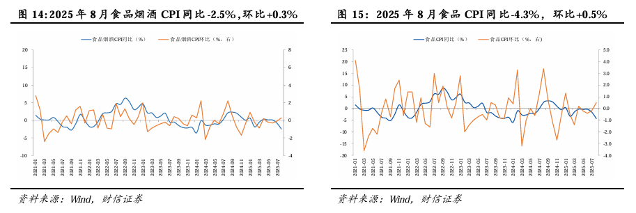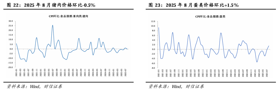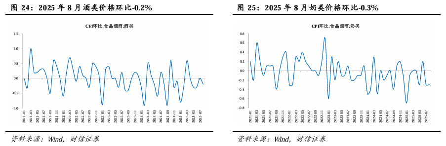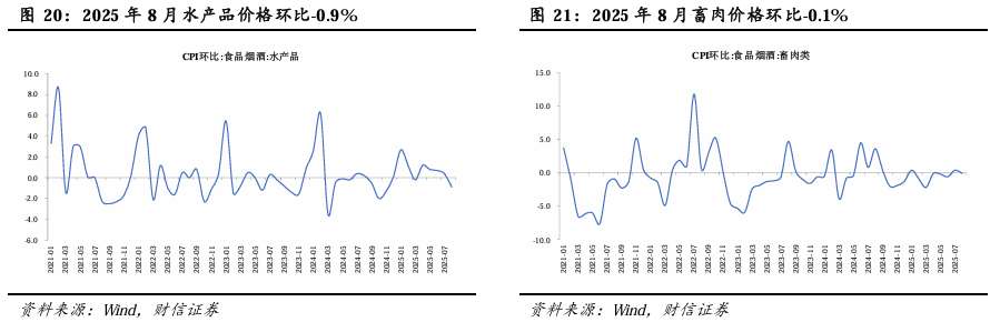 从同比看,受去年同期价格基数较高叠加需求偏弱影响,食品烟酒价格下降2.5%,影响CPI同比下降约0.72个百分点;食品价格下降4.3%,降幅扩大2.7个百分点,对CPI同比的下拉影响比上月增加约0.51个百分点,非食品价格上涨0.5%。食品中,鲜菜/蛋类/畜肉类/鲜果/粮食价格分别下降15.2%/12.4%/8.0%/3.7%/0.8%,分别影响CPI下降约0.37/0.08/0.25/0.08/0.01个百分点,其中猪肉价格下降16.1%,影响CPI下降约0.24个百分点;水产品价格上涨2.2%,影响CPI上涨约0.04个百分点;