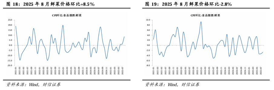 从环比看,食品烟酒价格环比上涨0.3%,影响CPI上涨约0.09个百分点;食品价格上涨0.5%,非食品价格下降0.1%。食品中,鲜菜/蛋类价格分别上涨8.5%/1.5%,影响CPI上涨约0.16/0.01个百分点;鲜果/水产品/猪肉价格分别下降2.8%/0.9%/0.5%,影响CPI下降约0.06/0.02/0.01个百分点。
