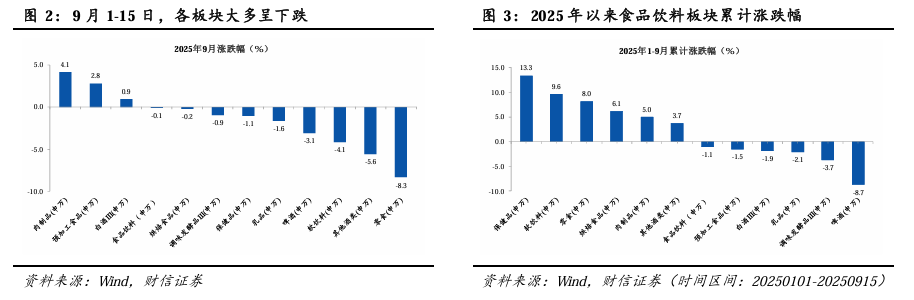 个股来看,9月份(9月1-15日)涨幅靠前的以预加工食品板块标的为主,跌幅较深的则主要为零食和乳制品板块标的。