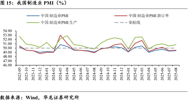2025年8月,我国制造业PMI为49.4%,环比+0.1pct,制造业景气水 平有所改善。生产指数为50.8%,连续4个月位于扩张区间,且增速加快, 表明制造业生产韧性较强。新订单指数为49.5%,虽仍处收缩区间,但小 幅回升,说明市场需求有所回暖,但基础尚不牢固,“需求不足”的矛盾依 然存在。产需对比看,生产指数高于新订单指数,一定程度上反映当前市 场需求恢复仍滞后于生产供给。