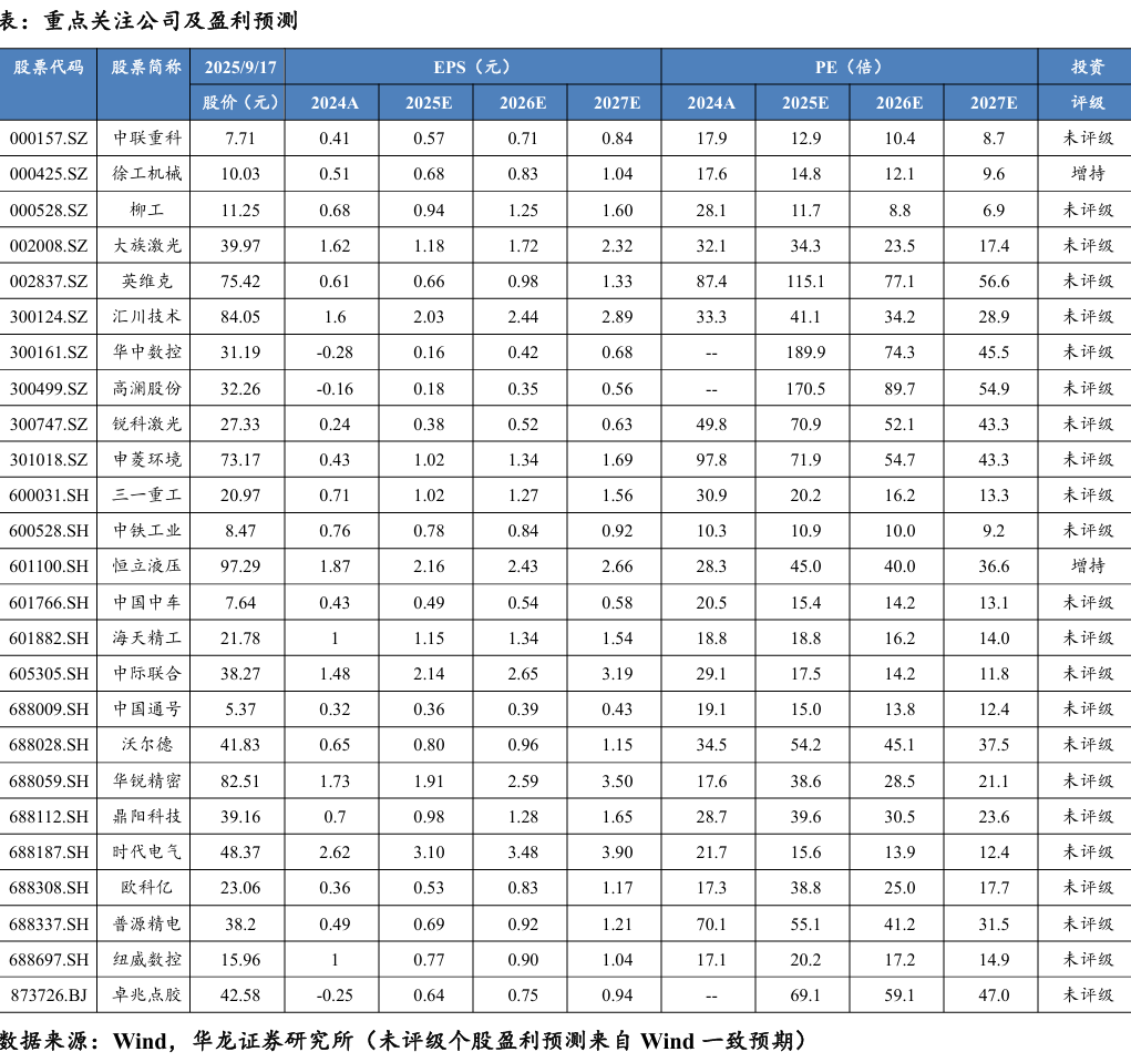 我们认为:内需受益于新一轮集中换新周期到来,以及雅下水电站、 新藏铁路等大型项目开工,以工代赈有望助力行业内需向好。海外结构性 景气,“一带一路”沿线国家的基础设施建设需求持续增长,带动出口增 长。龙头企业凭借“技术升级+全球化布局”双引擎,海外市占率持续提 升,中长期增长动能强劲。