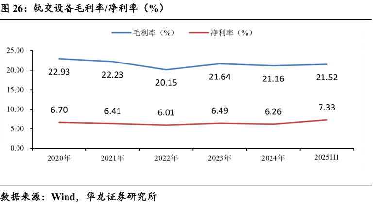 2025 年上半年轨交设备毛利率21.52%,同比+0.81pct;净利率7.33%, 同比+0.95pct,盈利能力有所改善。