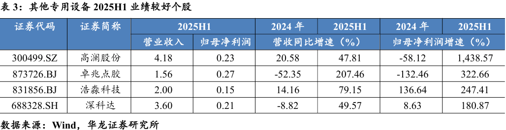 其他专用设备包含88支个股,表现不一。我们分别按照2025年上半 年营业收入增速和归母净利润增速由高到低排序,各选取前15支个股后进 行对照分析。发现业绩表现较好的个股有高澜股份(300499.SZ)、卓兆点胶(873726.BJ)、浩淼科技(831856.BJ)、深科达(688328.SH)。