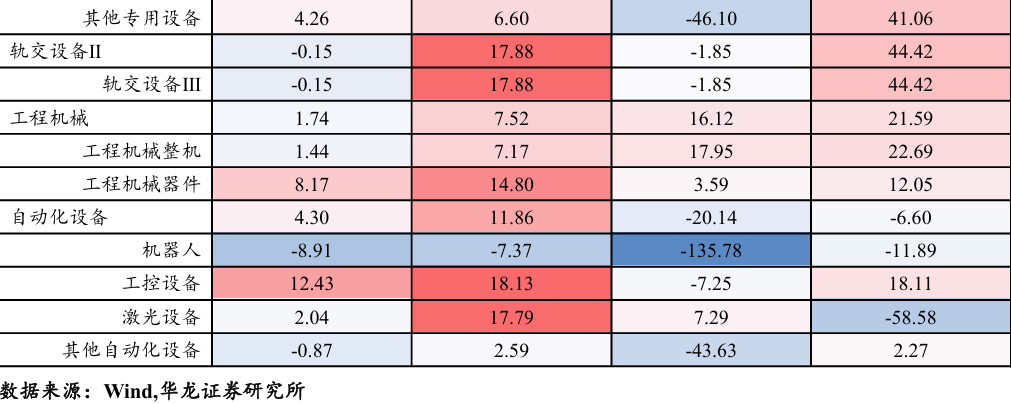 投资建议:上半年行业整体营收、利润均实现正增长,且利润增速远高于营收增速,行业基本面有所改善,维持行业“推荐”评级。通用设备:关注①内需筑底,海外表现较好,近年来伴随大国竞争的加剧,高端机床工具自主可控迫切性提升,可关注高端五轴机床、数控系统及核心功能部件的投资机会。②毛利率较高,受益于国产替代推进业绩改善明显的仪器仪表板块。个股:海天精工(601882.SH)、纽威数控(688697.SH)、华中数控(300161.SZ)、欧科亿(688308.SH)、华锐精密(688059.SH)、沃尔德(688028.SH)、普源精电(688337.SH)、鼎阳科技 (688112.SH)等。专用设备:关 注印刷包装机械、液冷以及消费电子设备。个股:申菱环境 (301018.SZ)、英维克(002837.SZ)、高澜股份(300499.SZ)、卓兆点胶(873726.BJ)等。轨交设备:轨交设备经过多年发展, 目前形成了较为稳定的竞争格局,龙头占据较大市场份额,建议关注龙头企业。个股关注:中国中车(601766.SH)、中铁工业 (600528.SH)、中国通号(688009.SH)、时代电气(688187.SH)等。 工程机械:国内外共同驱动,有望迎来长周期共振,关注主机龙头及核心零部件。个股:徐工机械(000425.SZ)、三一重工 (600031.SH)、中联重科(000157.SZ)、柳工(000528.SZ)、中 际联合(605305.SH)、恒立液压(601100.SH)等。自动化设备: 行业内部分化严重,关注工控及激光设备板块。个股:汇川技术 (300124.SZ)、锐科激光(300747.SZ)、大族激光(002008.SZ)等。