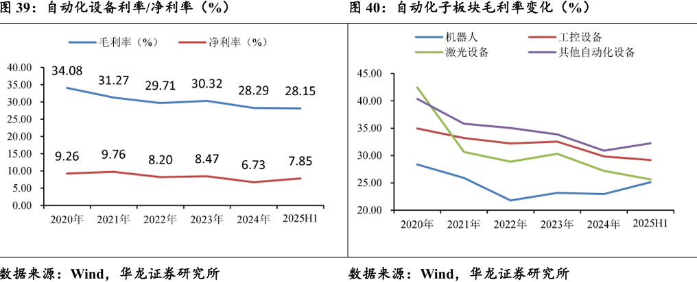 分子板块,收入端:工控设备&激光设备表现较好,机器人板块继续 筑底。2025年上半年子板块收入增速由高到低依次为工控设备(+18.13%)、 激光设备(+17.79%)、其他自动化设备(+2.59%)、机器人(-7.37%)。