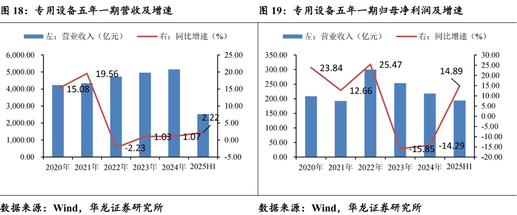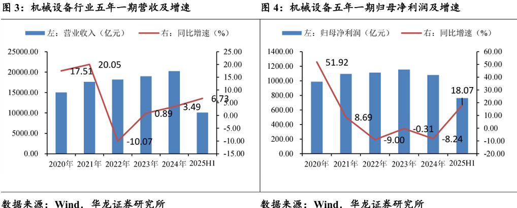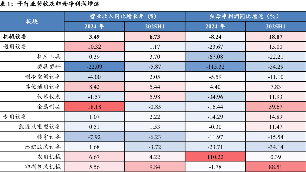 专用设备:内部分化,印刷包装&其他专用表现较好。专用设备 2025 年上半年实现营业收入2518.21亿元,同比+2.22%;实现归 母净利润193.89亿元,同比+14.89%。子板块表现分化,印刷包 装机械&其他专用设备表现较好,楼宇设备受房地产影响表现不 佳。