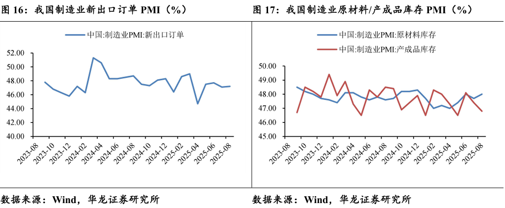 得益于我国出口多元化以及新兴市场需求的提振,2025年8月新出口 订单指数为47.2%,环比小幅回升0.1pct,呈现边际企稳迹象。