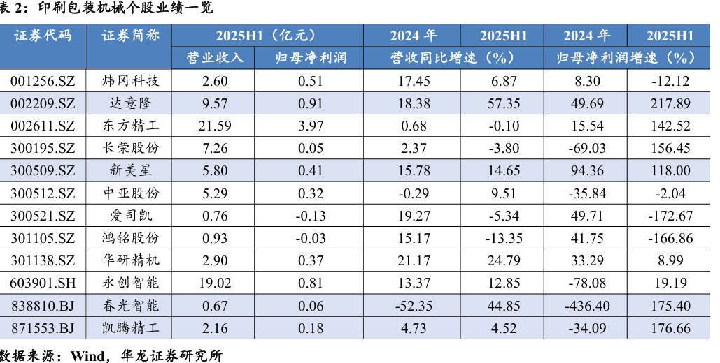 2025年上半年,印刷包装设备营收利润双增,且利润增速较高。我们进 一步分析个股,发现主要系达意隆(002209.SZ)、新美星(300509.SZ)、春光智能(838810.BJ)、凯腾精工(871553.BJ)等贡献主要增量。