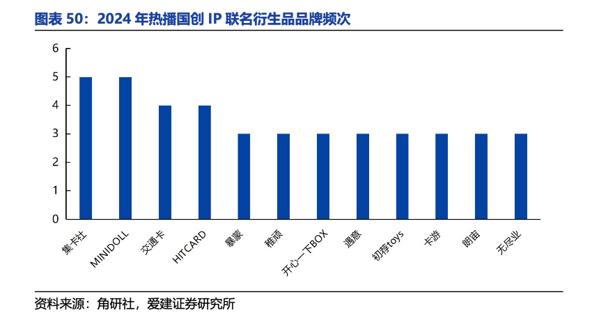 1)国产动漫IP拥有大量的粉丝群体,中国Z世代年轻人对优质国漫IP的认可度甚至超过很多海外IP。集卡社以正版授权动漫卡牌为切入点,成立当年便推出第一款卡牌产品《斗罗大陆》动画收藏卡,并成为爆款。集卡社立足国风文化、国漫作品等,持续挖掘更多展现中国元素的的卡牌产品,推出《秦时明月》《小倩》《异人之下》《解密》《红楼梦》《雄狮少年2》《哪吒2》等具有中国特色的影视作品典藏卡。2024年,集卡社和国创动画IP的合作频次达到5起,在衍生品品牌中并列最高。