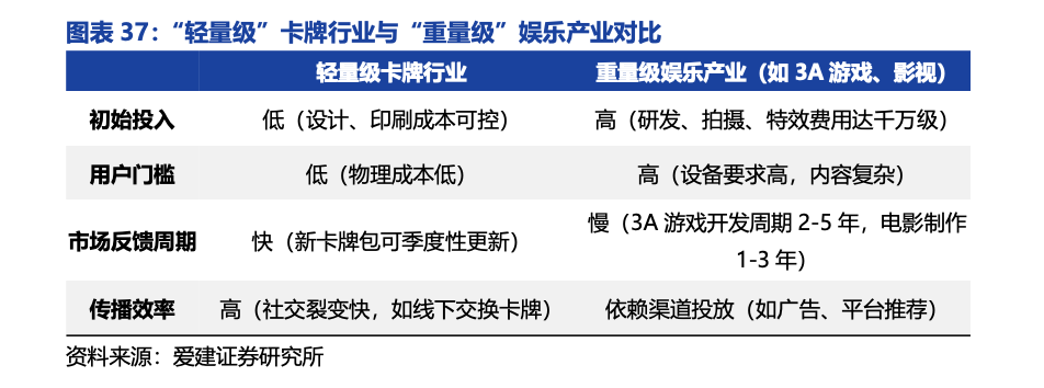 卡牌行业具有低门槛、低成本、高灵活性、易传播的特征,与重资产、高门槛的传统娱乐产业(如大型电子游戏开发、影视制作、主题乐园等)形成对比,相比重资产娱乐产业,卡牌行业强调“轻资产敏捷性”。针对传统娱乐高研发风险,卡牌行业以小步快跑的“微创新”持续输出,用极低试错成本捕捉市场新需求;在用户触达上,通过社群带动、线下快闪交换等“轻触达”方式,实现用户渗透。