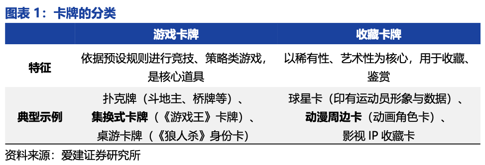近些年受到关注度比较多的卡牌主要为游戏卡牌中的集换式卡牌,以及收藏卡牌(特别是动漫周边卡),前者凭借策略玩法吸引大众,并形成玩家交流生态;后者则依赖IP的知名度和认可度与消费者建立情感联系。