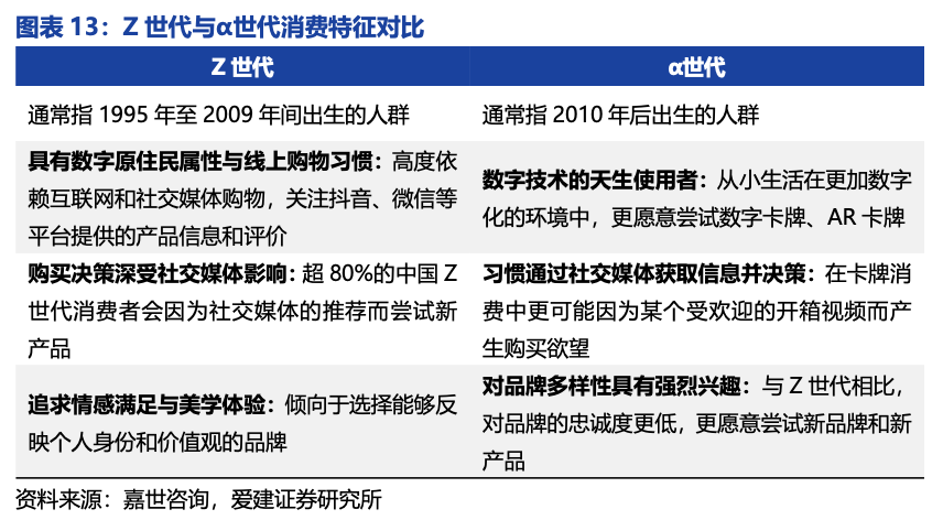 不同年龄段消费者具有不同的购买动机和消费习惯,呈现出跨代际差异。Z世代和α世代作为当前卡牌市场的主要消费力量,展现出一系列鲜明的特征和行为模式。Z世代身为数字原住民,依赖互联网、社交媒体购物,超80%会因社交平台推荐尝试新卡牌,还追求能反映自身身份价值观、兼具情感满足与美学体验的产品;α世代作为数字技术天生使用者,对数字、AR卡牌接受度更高,习惯借社交平台开箱视频等做消费决策,且对品牌忠诚度低,热衷尝新,二者差异为卡牌行业精准触达、运营客群提供了代际维度的洞察。