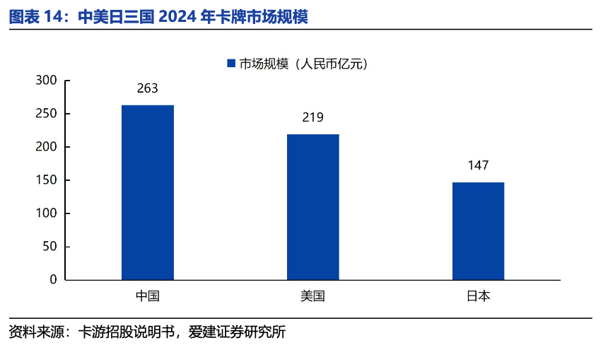 根据中国市场卡牌龙头企业卡游的招股说明书,2024年,按商品交易总额计,中国、美国和日本的集换式卡牌行业市场规模分别为人民币263亿元、219亿元和147亿元。中国已成为全球最大的集换式卡牌市场。