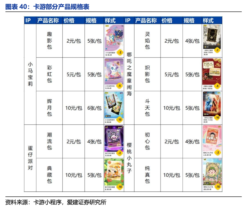 图表40是卡游部分产品,涵盖小马宝莉、哪吒之魔童闹海、蛋仔派对、樱桃小丸子等IP,借热门IP热度引流,样式贴合IP风格增强粉丝吸引力,可以看出,价格主要分为2元、5元、10元等档位,覆盖低中高不同层次消费需求,而同价格档位下规格也有差异,如2元包中,小马宝莉趣影包5张/包、哪吒之魔童闹海灵焰包4张/包,影响消费者性价比感知与购买决策,体现卡游通过多样化产品策略适配不同需求的布局思路。