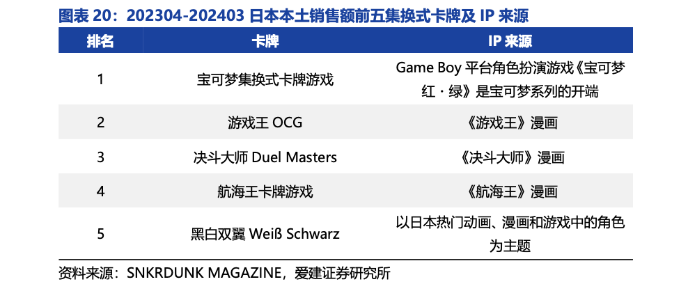从市场表现来看,日本销售额前五的集换式卡牌均来源于漫画或游戏。这充分证明了IP开发的成功,也凸显了动漫文化对日本卡牌产业的强大推动作用。这种娱乐性与社交性兼具的产业模式,不仅让玩家在收集和对战卡牌的过程中获得乐趣,还通过卡牌这一媒介,增强了粉丝之间的互动与交流,进一步丰富了日本的动漫文化生态。