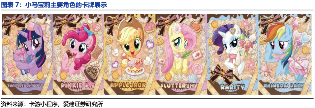 以深受儿童与女性群体喜爱的小马宝莉卡牌为例,其IP来源于美国公司孩之宝旗下的动画片《My Little Pony》。该动画围绕小马们的冒险故事展开,强调友谊、勇气等主题。动画包含了六位核心主角,每个角色拥有独特的性格、技能和“可爱标记”(代表个人特质的符号),世界观包含魔法、王室、不同种族。