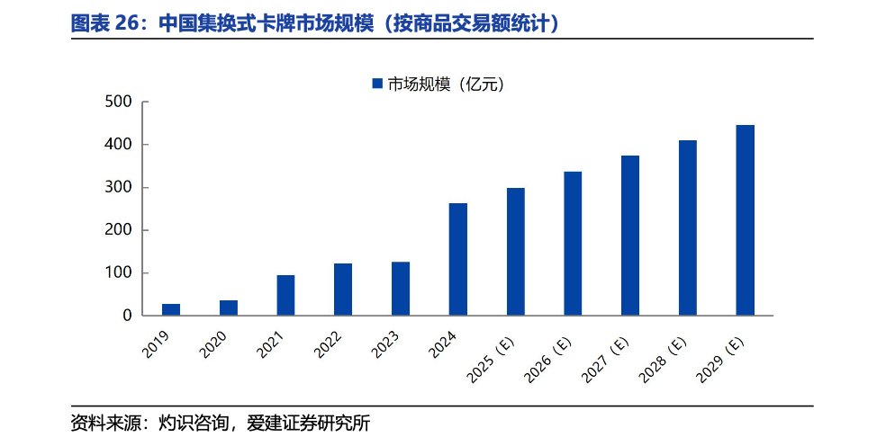 中国集换式卡牌市场规模呈现快速增长态势。中国集换式卡牌市场规模从2019年28亿元快速攀升至2024年263亿元,年均复合增速高达56.6%。从长期看,增速虽有所放缓,但规模仍然持续扩张,预计2029年达446亿元,2024-2029年年均复合增速仍有11.1%,产业正逐步走向成熟且规模不断壮大。