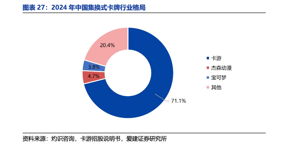 中国集换式卡牌行业集中度高,卡游是绝对龙头。卡游市占率稳居第一,2024年市占率高达71.1%。杰森动漫(集卡社)主要聚焦成人IP卡,2024年市占率为4.7%。