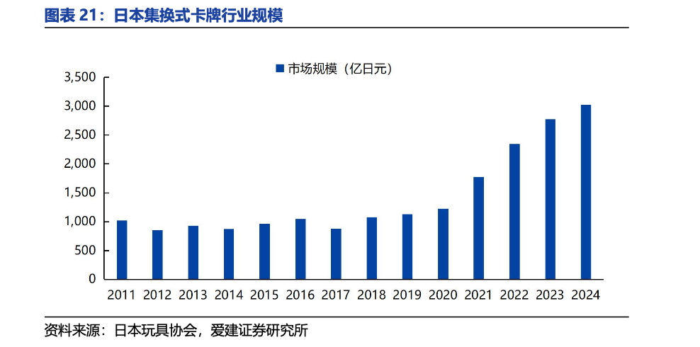 日本集换式卡牌行业近年增长趋势强劲。日本玩具协会数据显示,2020年之前,日本集换式卡牌行业规模较为稳定,保持在900亿日元上下,2020年后增长速度明显加快,2024年日本集换式卡牌市场规模达到3024亿日元,2020-2024年年均复合增长率达25.3%。