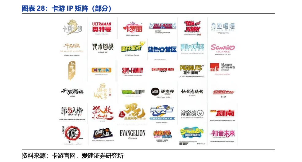 头部企业通过“授权IP+自有IP”组合打造IP矩阵。热门IP能够吸引大量忠实粉丝。为吸引消费者,卡游通过来自IP合作伙伴的授权和开发自有IP不断扩充IP矩阵,为持续设计、开发及推出新的泛娱乐产品奠定了坚实的基础,截至2024年底,卡游拥有70个IP组成的多元化矩阵,授权IP不仅涵盖《奥特曼》《火影忍者》等海外经典IP,还包括《哪吒2》等本土IP;自有IP《卡游三国》获评“中华文化符号”。