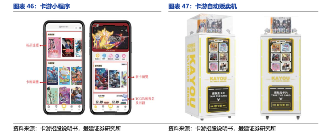 2)直营渠道包括线下旗舰店、自动贩卖机、线上自营店等。公司主要经营线下卡游旗舰店以直接与消费者进行互动并提升品牌知名度,亦设有线下自动贩卖机以提供便利的购买体验,此外还通过电商平台的在线自营店及其他在线销售渠道扩大在线布局,从而紧抓新零售机会。截至2024年底,公司在19个省份有32家线下卡游旗舰店,作为品牌展示、产品销售和TCG活动的枢纽,直接与消费者互动;有699台自动贩卖机在营运,提供便捷购买体验;在天猫、京东、拼多多、抖音、微信小程序、B站等平台开设13家在线自营店,抓住新零售机遇,并收集消费者反馈。