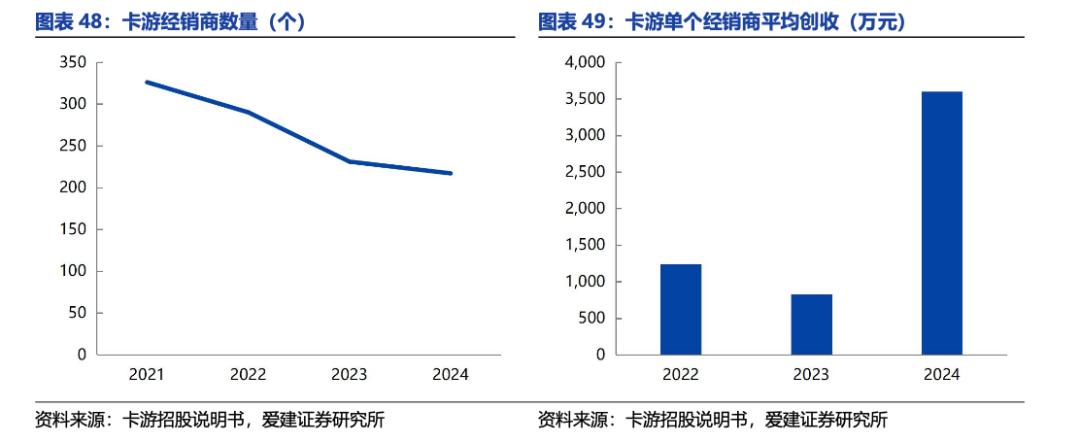 1)经销商为公司核心渠道,随着其他渠道的拓展,经销商渠道营收占比持续下降,从2021年96.8%下降至2024年80.2%。截至2024年底,有217家经销商,覆盖31个省份及部分海外地区。公司提供培训、库存管理、营销等多方面支持,并进行价格和渠道管理,防范压货和窜货风险。KA渠道包括知名超市、零售门店、电商平台等39家合作伙伴;此外,公司于2023年开始运营加盟模式小型零售店,截至2024年底,公司拥有351个卡游中心。