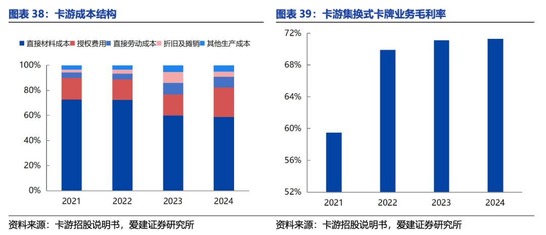 从卡游集换式卡牌业务的毛利率看,毛利率高且近年来大幅上升,从2021年59.5%提升至2024年71.3%,主要系引进先进生产设备,改进生产工艺,提高生产效率,以及受益于规模经济,加强采购成本控制,直接材料成本占比显著下降。