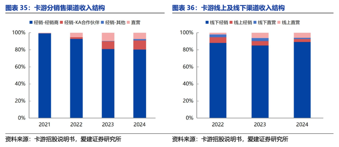 线下渠道占比高,对经销商依赖程度高。以卡游为例,经销商为公司核心渠道,截至2024年底,有217家经销商,覆盖31个省份及部分海外地区。公司为渠道提供培训、库存管理、营销等多方面支持,并进行价格和渠道管理,防范压货和窜货风险。KA渠道包括知名超市、零售门店、电商平台等39家合作伙伴;此外,2023年开始运营加盟模式小型零售店,截至2024年底,公司拥有351个卡游中心。