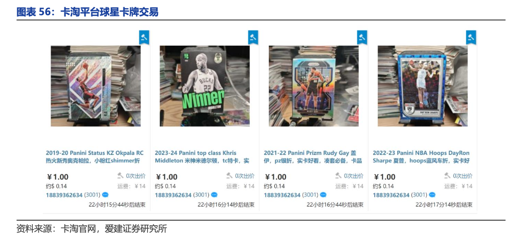 2)球星卡业务。姚记科技通过战略投资布局,进入了球星卡领域。2022年,姚记科技通过战略投资持有上海璐道粗体育文化发展有限公司38%股份,间接持有DAKA文化和Card Hobby卡淘股权,其中,DAKA文化是中国领先的卡牌IP发行商,专注于球星卡的发行和销售,业务覆盖足球、篮球、电竞等多个领域,拥有丰富的版权资源和产品线,近年购买的版权IP从中国延伸至海外,如巴塞罗那足球俱乐部等海外热门球队的版权;卡淘聚焦体育类卡牌收藏交易,是中国专业度较高的头部二手收藏卡平台,主要收入来源于向卖家收取中介费。