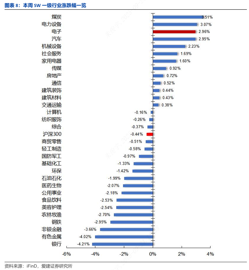 本周SW电子行业指数(+2.96%),涨跌幅排名3/31位,沪深300指数(-0.44%)。SW一级行业指数涨跌幅前五分别为:煤炭(+3.51%),电力设备(+3.07%),电子(+2.96%),汽车(+2.95%),机械设备(+2.23%),涨跌幅后五分别为:银行(-4.21%),有色金属(-4.02%),非银金融(-3.66%),钢铁(-2.95%),农林牧渔(-2.70%)。