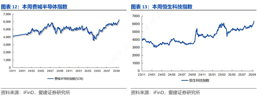 费城半导体指数(SOX)本周涨跌幅为+3.84%;恒生科技指数本周涨跌幅为+5.09%。