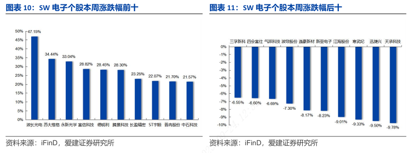 本周SW电子行业涨跌幅排名前十的股票分别是:波长光电(+47.15%),苏大维格(维权)(+34.44%),永新光学(+33.04%),富信科技(+28.82%),德明利(+28.45%),腾景科技(+28.30%),长盈精密(+23.25%),ST宇顺(+22.07%),普冉股份(+21.70%),中石科技(+21.57%)。