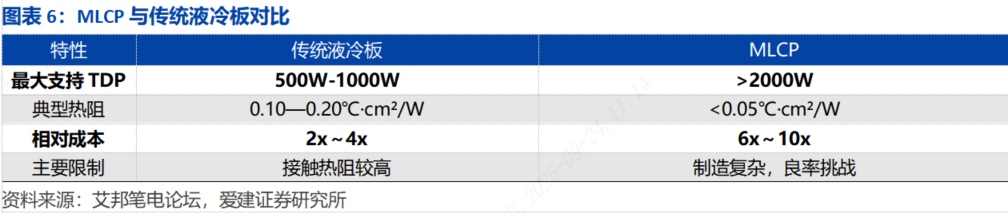 相较于传统液冷板,MLCP支持的TDP功耗更高(>2000W),能更好适配高功率密度器件的散热需求,且热阻更小(<0.05℃·cm²/W),但同时它的成本也相对更高。