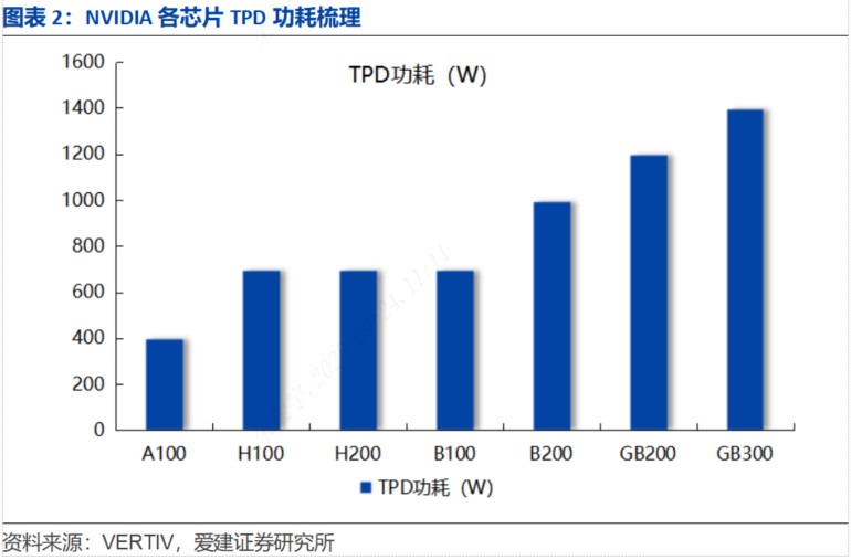 大算力需求正推动芯片功耗上升。在芯片层面,以NVIDIA为代表的主流厂商推出的产品,在算力提升的同时,功耗也快速增长:NVIDIA AI芯片功率从A100的400W增加至GB200的1200W、GB300的1400W。