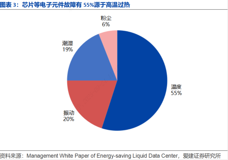 高温会直接影响AI服务器中芯片等核心电子元件的使用寿命,进而诱发服务器故障。从故障成因来看,电子元件故障有55%源于高温过热:服务器核心的半导体元器件(如GPU等算力芯片)对温度敏感,温度每升高10℃,反向漏电流便会增加1倍,显著加速元件损耗。