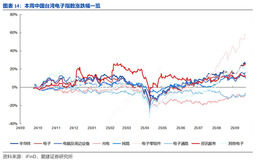 中国台湾电子指数各板块本周涨跌幅分别是:半导体(+0.85%),电子(+0.69%),电脑及周边设备(-0.19%),光电(+2.07%),网路(-2.57%),电子零组件(+3.06%),电子通路(+3.05%),资讯服务(-1.06%),其他电子(-1.48%)。